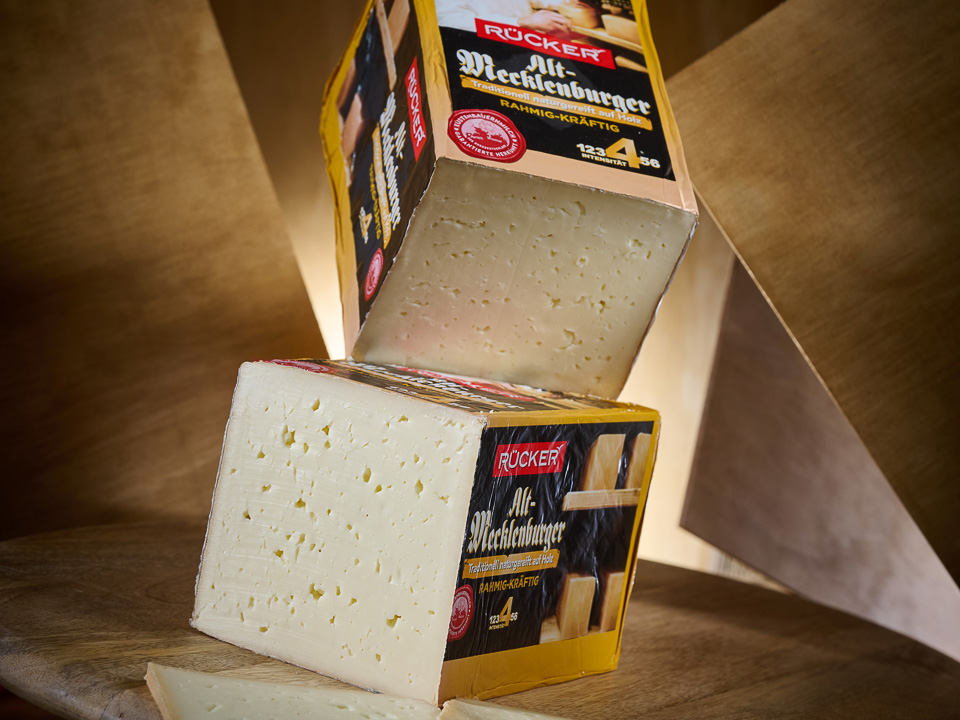 Vor 135 Jahren auf Fehmarn gegründet, produziert die Familienmolkerei Rücker heute in Aurich und Wismar ihre Käsespezialitäten. Dazu gehört auch die Sorte Alt-Mecklenburger: ein naturgereifter Tilsiter, der als Markenzeichen der Molkerei gilt.