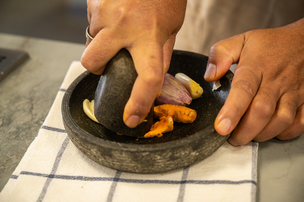 Während Chehmirans Messer flugs durch Auberginenfleisch quietscht, duftet bei Haris bereits das Huhn für die Vorspeise aus der Pfanne. Frühlingszwiebeln, Kurkuma, Knoblauch, Ingwer und Limette warten auf ihren Einsatz. „Soto Ayam erinnert mich an meine Kindheit“, erzählt der auf den Java-Inseln geborene Haris. „Wenn einer von uns Erkältung oder Grippe hatte, kochte unsere Mutter immer diese Suppe, und wir mussten sie heiß essen. Am nächsten Tag konnten wir wieder draußen spielen.“ Kein Wunder bei so viel gesunden, frischen Gewürzen! Frisches spielt auch in Stefanies Rezept eine große Rolle: „Meine Holunderbeeren sind selbst gesammelt. Da stand ich zum Pflücken in Gummistiefeln im Knick. Die Beeren kann man prima einfrieren und dann nach Bedarf zubereiten“, sagt sie und strahlt die in Rotwein badenden Früchte an. Dazu gibt’s den nächsten Tipp für den alpenländischen Nachtisch: „Man sollte einen trockenen, frischen Wein nehmen.“ Zum Beispiel einen Südtiroler Lagreiner, eine Rebsorte, die auf über 500 Metern Höhe wächst. Der passt gut zu den Beeren, „die wiederum ein bisschen Bitterkeit reinbringen“.