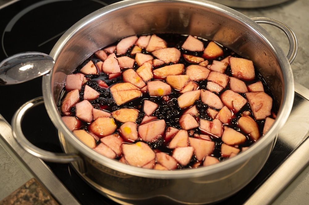 Bei Chehmiran ist es inzwischen bunt geworden: Rote, gelbe und grüne Paprika kuscheln mit den dunkelvioletten Auberginen im Ofen. Haris pellt die gekochten Eier für die Suppeneinlage, dann steht er plötzlich neben Chehmiran: „Kann ich dir helfen? Ich muss gerade eh warten.“ Die beiden bestreichen hauchdünnes Fladenbrot mit etwas Olivenöl und Paprikapaste und sind dabei sehr fokussiert. Auch im nächsten Arbeitsgang, als gehackte Petersilie und rote Zwiebelstückchen auf den Broten landen. Stefanie, in dezent-schicker Tracht gekleidet und mit schwarzweiß gemustertem Tuch auf dem Kopf, ist ebenfalls am Anrichten; das Kompott soll schließlich noch etwas abkühlen, bevor es verzehrbereit ist. „Dieses Dessert ist bei uns im Alpenraum die ‚Grütze des Südens‘. Auch Kinder essen es sehr gern”, plaudert sie und verrät, dass sie das Gericht, das sich übrigens prima für Partys vorbereiten lässt, gern auch mit wilden Blaubeeren, ihrem Lieblingsobst, kocht.