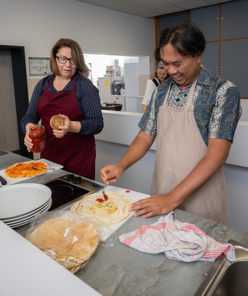 Esst ihr gerne scharf?“ Chehmiran wedelt mit einer roten und zwei grünen Chilischoten, lacht – und dürfte sich über Haris‘ genauso prompte wie überzeugte Antwort freuen: „Ich liebe scharf!“ Das Eis ist gebrochen an diesem Freitagabend im nordfriesischen Leck. Stefanie, Chehmiran und Haris werkeln und witzeln, als würden sie sich schon ihr Leben lang kennen. Dabei ist die Passion fürs Kochen das Einzige, was die drei bis hierher verbindet. Und dass sie diese an der Volkshochschule Leck weitergeben: Haris in Indonesisch-Kochkursen, Stefanie auf geführten Pilz- und Kräuterwanderungen und Chehmiran in den „Küchen der Welt“.