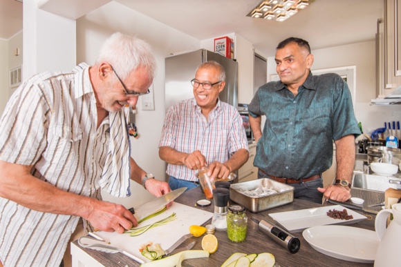 Plötzlich tauchen vier junge Leute in der Küche auf. Roshan, der Sohn des Hauses, ist mit seinen Kumpels und seiner Freundin zur kurzen Stippvisite eingetroffen. „Oh Mann, riecht es hier gut“, ruft er. „Wir haben riesigen Hunger.“ Alle philosophischen Gespräche sind damit beendet. Jetzt heißt es: Tisch decken, nochmals in die Töpfe gucken, den Zander aus dem Ofen holen. Salvatore passiert seine Soße durch ein feines Sieb. Inzwischen ist auch Tuans Frau Barbi eingetroffen. Auf einmal sitzen acht Personen am Tisch. Salvatore schaut zufrieden in die Runde und schenkt den Wein ein: „Die beste Möglichkeit, sich zu unterhalten, ist beim Essen. Wenn es dann noch so kosmopolitisch zugeht wie hier, ist es doppelt schön.“