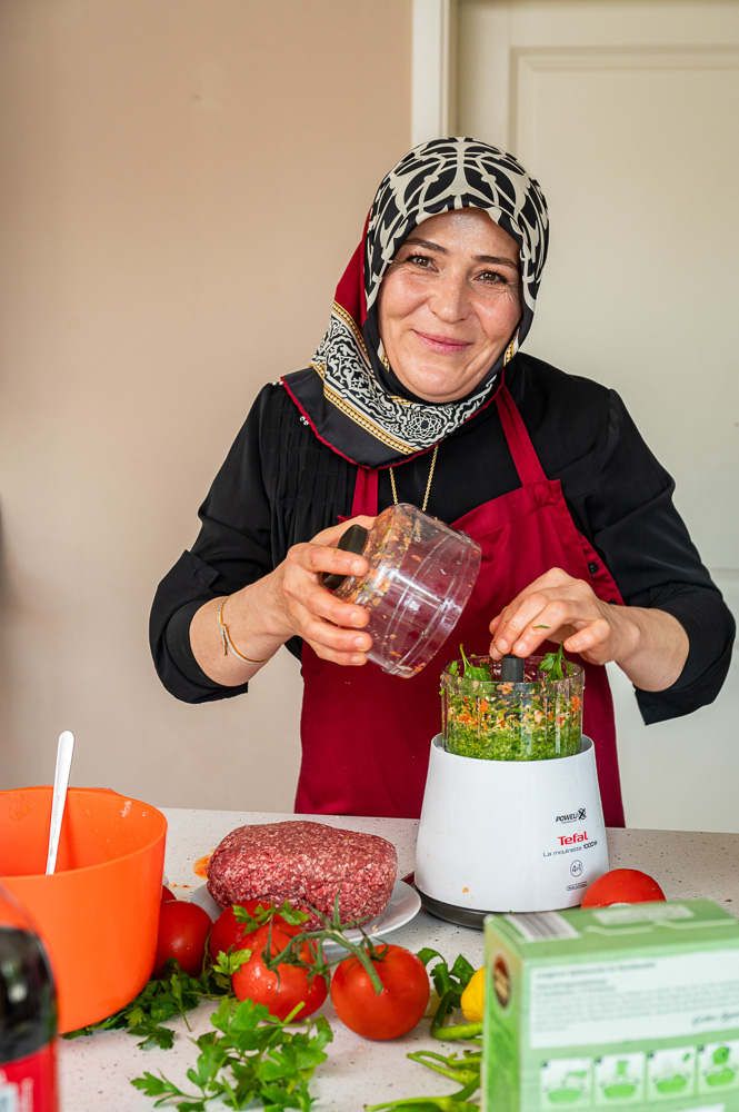 Die Wahl der Rezepte macht die Organisation in der Küche ganz entspannt: Cara benötigt für den Kuchen nur den Backofen, und Eduardo kann für sein Hauptgericht den Herd ganz allein nutzen. Nuran hat ihren eigenen Ofen mitgebracht. Tatsächlich schleppt sie sogar zwei Geräte in die Küche: ein kompaktes eckiges und ein rundes. „Das runde nutzt meine Schwägerin gern, ich nehme lieber meinen türkischen Ofen“, erklärt sie. „Lahmacun funktioniert aber auch in einem normalen Backofen.“ Rasch fängt sie an, den Hefeteig zu kneten, damit er Zeit zum Gehen hat. „Für meine Familie reicht ein Kilo Mehl meist nicht. Wenn Besuch kommt, nehme ich oft drei Kilo – mein Sohn bringt manchmal einen deutschen Freund mit, der Lahmacun liebt“, erzählt sie und lacht.