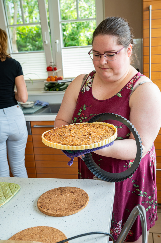 Cara schaut immer wieder in ein Büchlein, in dem sie Rezepte aus ihrer Heimat aufgeschrieben hat. „Der Kuchen ist ein typisches Südstaaten-Rezept“, erklärt sie. Die 30-Jährige hat erst in Deutschland angefangen, sich für Kochen und Backen zu interessieren. „Mein Mann ist zwar Koch, aber er hat ein Restaurant mit Catering-Betrieb und arbeitet viel. Da ist es gut, wenn ich mich um das Essen kümmern kann.“ Ruck, zuck hat sie den Fertigteig in die Tarteform gedrückt und die Füllung aus braunem Zucker, Sirup, Gewürzen, Eiern, Nüssen und Kokosraspeln zusammengerührt. „Man kann die Pekannüsse ganz normal verwenden, ich habe sie aber kurz geröstet, mit etwas Salz und Vanille.“ Nach Maissirup und dem typisch amerikanischen „packed brown sugar“ musste sie hier in Deutschland etwas suchen. „Er ist mit Melasse vermischt, dadurch schmeckt er kräftiger. Das kann man auch selbst machen.“