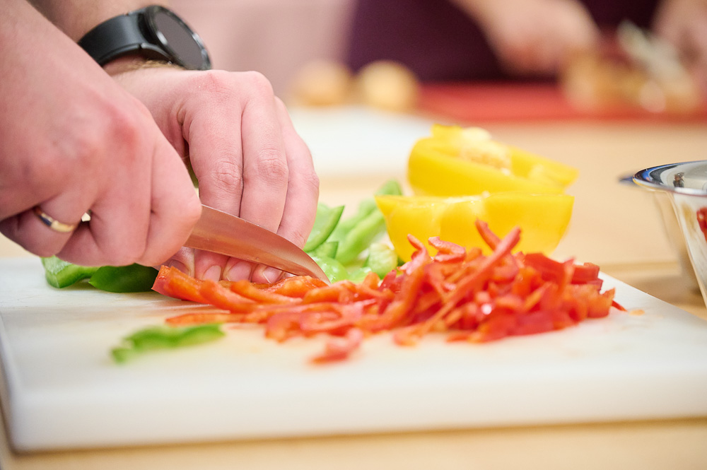Die drei Köchinnen stellen noch eine Gemeinsamkeit fest: In allen drei Ländern wird viel Fleisch gegessen. Katja erzählt von ihrer Oma, die früher in der Ukraine Enten und Hühner gehalten hat. Das Fleisch wurde direkt verwertet. Und Claudia lässt die anderen wissen, dass Brasilianer auf die deftige Küche stehen. „Alles ist gut gewürzt. Vor allem im Norden des Landes essen wir gern scharf.“ Schwarze Bohnen und Reis sind meist dabei. Während in der Rendsburger Volkshochschule geschnippelt, gebraten und püriert wird, läuft Monika Hefner von der Initiative „Über den Tellerrand“ mit einem fröhlichen Lächeln durch die Räume, hilft hier und da und versucht, alle internationalen Hobbyköche einzubinden. „Nichts verbindet so gut wie Kochen“, findet sie und freut sich, dass etliche Ehrenamtliche seit Jahren bei dem Projekt mitmachen. Zum Schluss wird der große Tisch gedeckt, und es gibt viele Ahs und Ohs zu den unterschiedlichen Gerichten. Über den Tellerrand zu schauen, ist inspirierend – und auch richtig lecker.