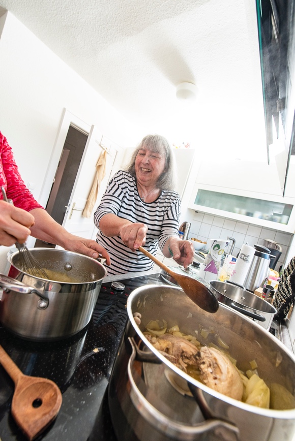 Marie-Ghislaine hat sich unterdessen mit den Zwiebeln beschäftigt. „Seht ihr, ich musste dabei nicht weinen. Kennt ihr den Trick?“ fragt sie. „Einen Schluck Wasser in den Mund nehmen!“ Während sie die Zwiebeln brät, erzählt sie von ihrer Heimat. „Bei uns muss das Kochen schnell gehen, damit Zeit für anderes bleibt.“ In ihrer Familie, die es nach dem Zweiten Weltkrieg vom Norden Frankreichs nach Bordeaux verschlagen hatte, durften Lebensmittel nicht viel kosten. „Heute machen wir es ebenso. Wenn ich etwas Gutes günstig sehe, greife ich zu.“ Viel Zeit zum Kochen nimmt sie sich gewöhnlich nicht; lieber liest sie oder arbeitet an ihren wissenschaftlichen Studien und Übersetzungen. Die Zwiebeln müssen raus aus dem Topf, die Hähnchenschenkel rein. Sie sollen schön braun brutzeln und schmoren dann zusammen mit den Zwiebeln, Pfeffer und Salz. „So, eine Dreiviertelstunde Ruhe. Typisch französisch“, sagt sie zufrieden und beginnt, ihre Töpfe abzuspülen.