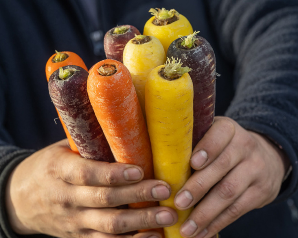 Ursprünglich waren Möhren gelb, rot, weiß oder violett. Erst im 17. Jahrhundert entwickelten Züchter zu Ehren des niederländischen Königshauses das Gemüse in leuchtendem Orange. Seit einigen Jahren baut Familie Meyer auf 32 Hektar auch die alten bunten Sorten an. Noch ist es eher eine Nische, aber die Nachfrage wächst. „Obwohl die bunten Sorten kulturhistorisch sehr viel älter sind, ist ihr Anbau viel komplizierter und anspruchsvoller“, sagen die Möhrenexperten. „Die Varietät ist breiter, weil das Gemüse noch nicht so durchgezüchtet ist. Ein und dieselbe Sorte wächst in einem Jahr 20, im nächsten Jahr 35 Zentimeter lang.“ Aber die Meyers sind sich einig: Die bunten Möhren sehen einfach schick aus sind eine tolle Ergänzung des Sortiments.
