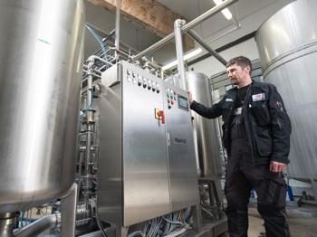 3 Produktionsleiter Lutz Wansner entscheidet, wie viel Kohlensäure dem Wasser zugesetzt wird. Per Menüführung wählt er aus, ob als nächstes „Flaute“, „Böe“ oder „Sturm“ in die Flasche kommt. Den Produktionsplan erstellt er je nach Lagerbestand am Vorabend, sodass am kommenden Morgen alle Mitarbeiter genau wissen, was im Laufe des Tages produziert wird.