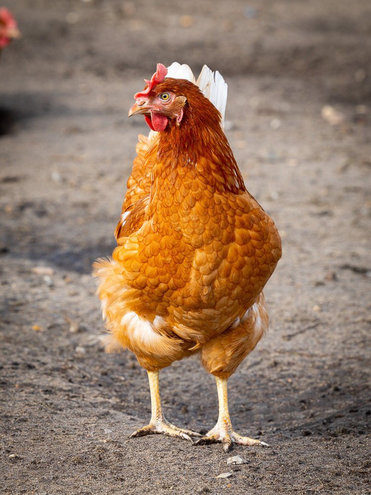 So viel Höflichkeit muss sein! Bevor Teresa-Marie Pelka und Carsten Voß einen ihrer Hühnerställe betreten, klopfen sie freundlich an die Tür. „Dann wissen die Hennen, dass sie jetzt Besuch bekommen werden, und erschrecken sich nicht“, sagt Carsten Voß. Tatsächlich nehmen die Tiere kaum Notiz von uns, als wir vorsichtig durch die Tür in den Stall treten. Insgesamt leben auf dem Hof 40.000 Hennen in großzügigen Volieren mit Wintergarten und bepflanztem Freigelände. Die Hälfte davon wird entsprechend der strengeren Bio-Verordnung gehalten und gefüttert. Als Küken werden sie, wie gesetzlich vorgeschrieben, in Bruderhahnhaltung aufgezogen; das übernimmt ein Zuchtbetrieb. Mit 18 Wochen ziehen die Junghennen auf dem Cassenshof ein. „Dann sind sie mitten in der Pubertät“, schmunzelt Teresa-Marie Pelka.