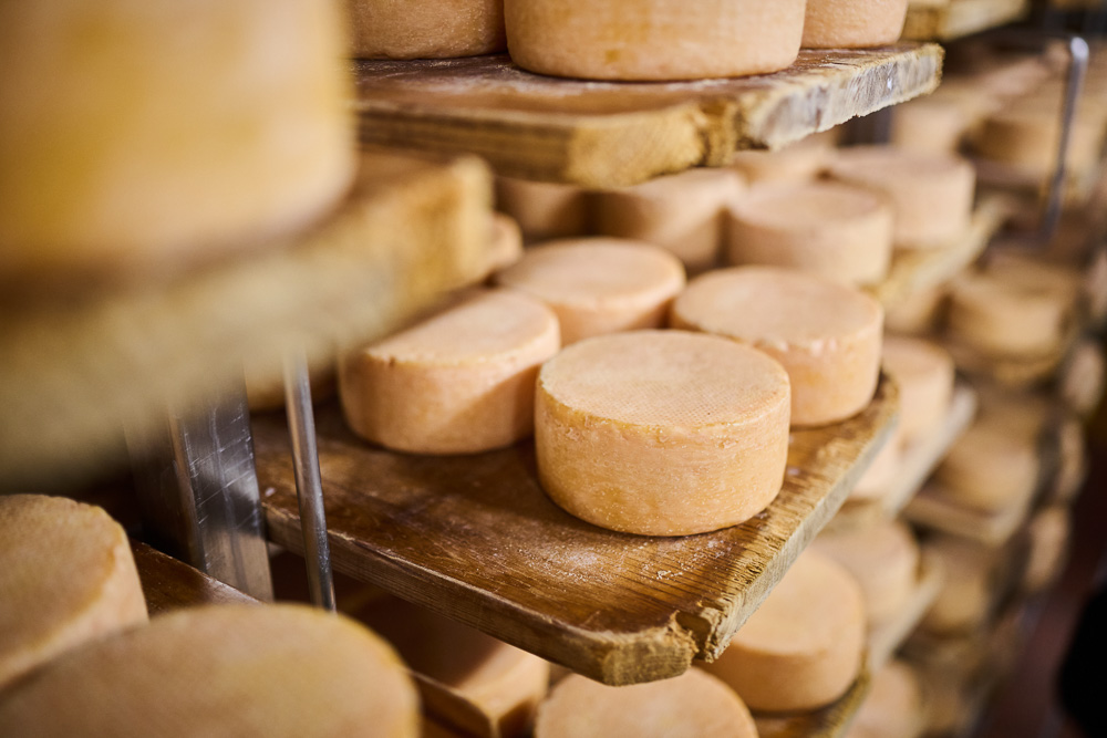 Eine Etage tiefer liegt der Gewölbekeller: die heiligen Hallen des Betriebs mit Platz für bis zu 60.000 Käselaibe. In den Regalen lagern Köstlichkeiten vom milden Marienburger, mit 60 Prozent Fettgehalt und sahnig-cremigem Charakter ein wahrer Gaumenschmeichler, über den würzigen Nordseekäse bis zum aromatischen Gewölbekäse. Bis zu sechs Wochen dürfen die Käselaibe bei 14 bis 17 Grad reifen, bis sie in die Kühlung umgelagert werden. Währenddessen bekommen sie nicht nur Ruhe, sondern auch jede Menge Zuwendung. Acht der mehr als 40 Mitarbeiterinnen und Mitarbeiter kümmern sich ausschließlich um die Käsepflege: Auf der Käsewischmaschine werden die Käselaibe mit Rotschmierekulturen bestrichen und von da an nicht mehr aus den Augen gelassen. „Mindestens zwei- bis dreimal pro Woche wird jeder Käse angefasst“, erklärt Mitarbeiter Frank Krüger. Die Qualität erkennt der Fachmann mit allen Sinnen: Die Färbung der Rinde und ein Drucktest verraten den Reifegrad, ein Klopfen auf den Laib zeigt, wie es um die Löcher im Inneren bestellt ist. Und natürlich wird auch die Nase eingesetzt.