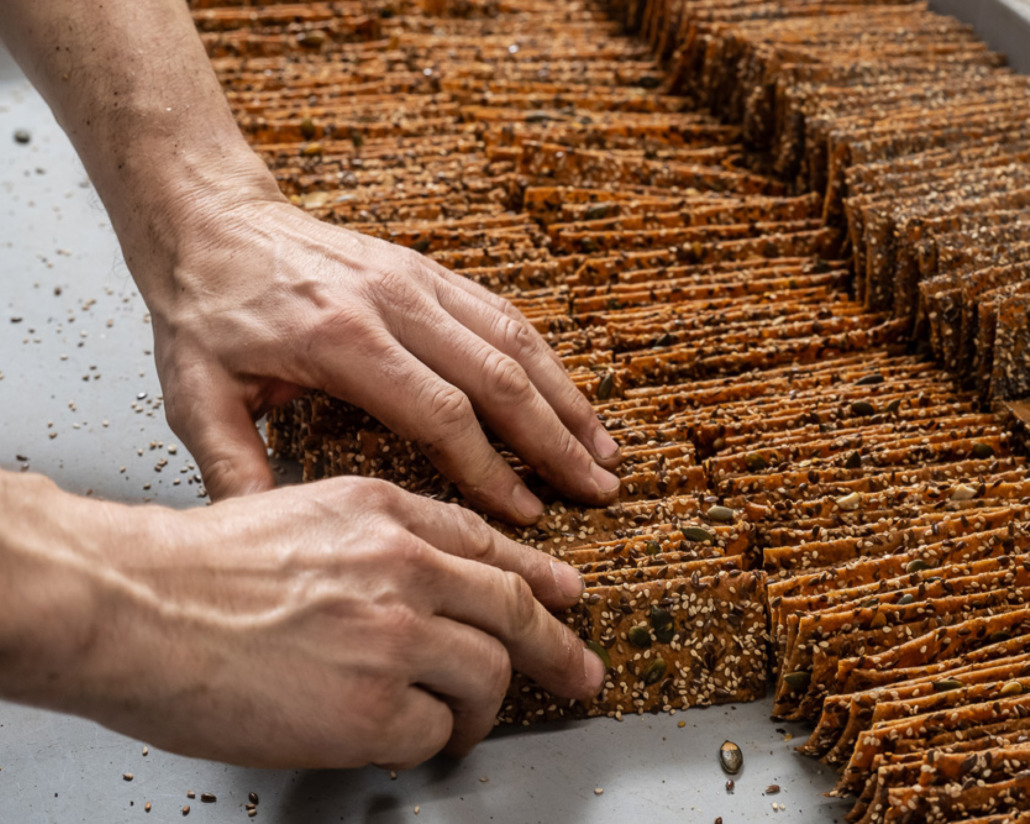Die Kornkracher von Familie Rasche sind weit über den Ortsrand von Zernien hinaus so beliebt, dass es in der Backstube ein spezielles Zeitfenster und gutes Teamwork braucht, um ausreichende Mengen davon zu backen. Der Teig enthält Weizenoder Dinkelmehl, Natursauerteig sowie Leinsaat und Sesam. Zuerst wird er auf ein Laufband gelegt, per Hand gut mit Mehl bestäubt und dann mit einer automatischen Walze ganz dünn ausgerollt. Danach landet er auf großen Backblechen und wird mit verschiedenen Zutaten belegt. Was darf es sein? Zur Auswahl stehen Kornkracher mit Kümmel und Salz, mit Saaten oder Käse. Zum Schluss werden die Streifen auf dem Blech zugeschnitten und in die großen Backöfen geschoben. In Zernien im Landkreis Lüchow-Dannenberg haben die Rasches vor fast 90 Jahren ihren Familienbetrieb gegründet. Jochen Rasche, der heutige Seniorchef, erzählt von seinem Großvater August, der im Jahr 1939 den Betrieb als klassische Landbäckerei eröffnete. Dessen Sohn, August junior, übergab 1996 den Betrieb wiederum an seinen Sohn, Jochen. Er stellt seitdem als „Generation Bio“ in der Backstube ökologische Backwaren her und fasst die Philosophie der Bäckerei so zusammen: „Wir setzen auf beste Zutaten aus der Region. Wir lassen unseren Teigen ausreichend Zeit zu reifen und verarbeiten jedes einzelne Backwerk von Hand.“ Im vergangenen Jahr erfolgte der nächste Generationswechsel. Jochen Rasches Sohn Sören, der nach dem Abitur Erfahrungen unter anderem in Kanada und Australien sammelte und in Berlin seine Ausbildung absolvierte, ist nun in der vierten Generation der Chef. Vater Jochen Rasche ist noch zu jung für den Ruhestand, wie er lachend sagt, und arbeitet weiter mit. Zugleich weiß er den Betrieb bei Sören in den besten Händen. Der wiederum betont, dass er gemäß der Familientradition auch weiterhin auf gutes Handwerk, Teamwork und Bioqualität setzt. Die beliebten Kornkracher sind dafür der knusprig-leckere Beweis. Erhältlich bei famila in Dannenberg, Lüneburg, Munster und Schneverdingen.