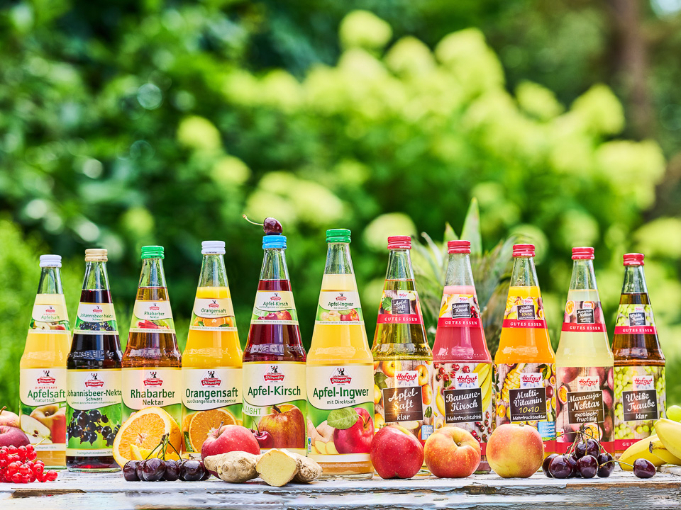 Der 68-Jährige übernahm den Betrieb 1990 von seinem Vater. Der war ein geschickter Tüftler und hatte 1948 die Idee, mit einer selbst gebauten Obstpresse Äpfel und Johannisbeeren zu verarbeiten. Bis heute setzt Steinmeier auf Mehrweg-Glasflaschen, von denen inzwischen bis zu 10.000 pro Stunde gereinigt und befüllt werden. Manchmal bleibt dem Süßmoster sogar Zeit, neue Geschmacksrichtungen zu kreieren. Der jüngste Zuwachs: Apfel-Hopfen mit einer leicht herben und frischen Note. Für Fans zarter Schärfe gibt es, ebenfalls neu, Apfel-Ingwer. Neben Apfelsaft stammen aus der Mosterei auch Fruchtsäfte und Nektare aus Traube, Johannisbeere, Rhabarber, Orange, außerdem Vitamin- und Multisäfte sowie Apfel- und Kirschweine. Und wer immer schon wissen wollte, wo die leckeren Hofgut-Säfte herkommen, braucht nicht länger zu rätseln: Mehrere Sorten werden hier in der idyllischen Schleiregion vom 13-köpfigen Mostereiteam produziert und abgefüllt.