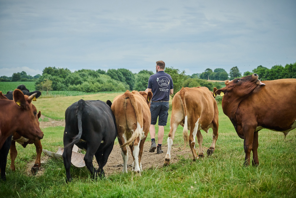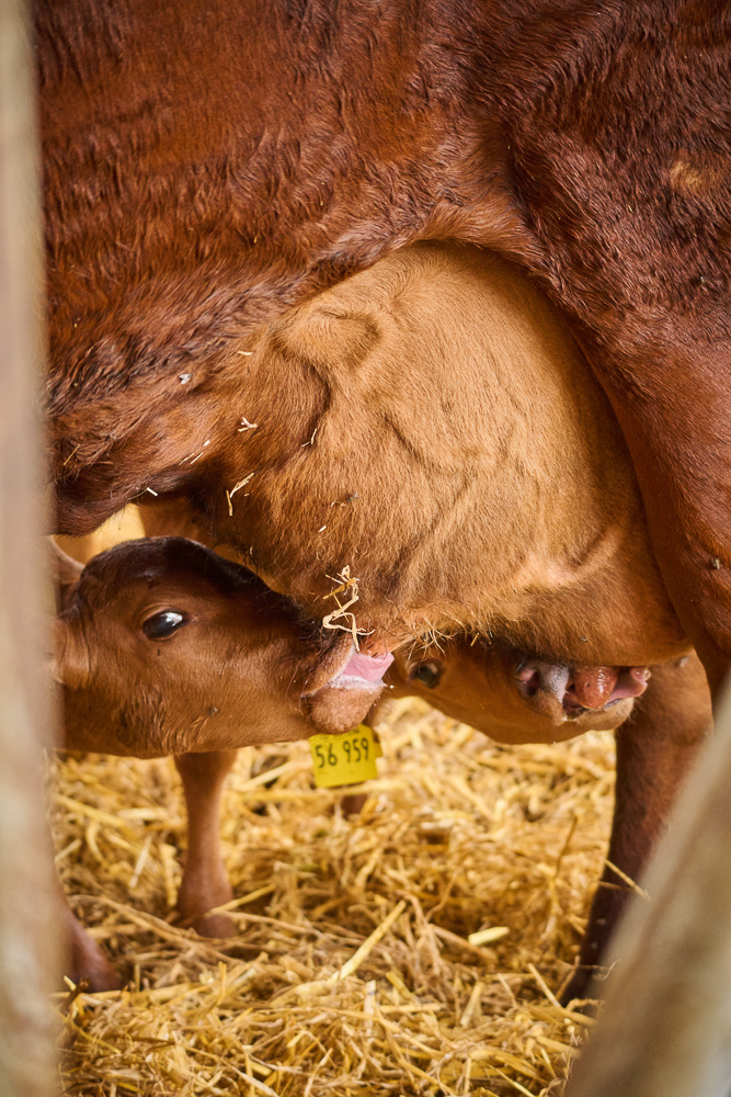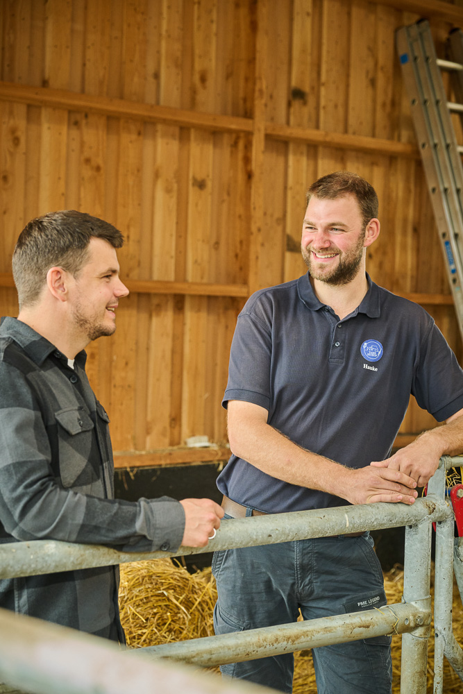 Wer Milch oder Joghurt, Butter oder Sahne der Bauerngemeinschaft Hamfelder Hof kauft, gönnt sich nicht nur gute Bioprodukte aus der Meierei im Kreis Herzogtum Lauenburg, sondern fördert auch eine zukunftsfähige Landwirtschaft. Geschäftsführer Janosch Raymann betont: „Wir haben uns hohe Ziele gesetzt und krempeln das System ein Stückweit um. Aber wir sind überzeugt, dass wir das Richtige tun.“ Hauke Tams nickt. Die beiden stehen auf Tams Biohof in Ausacker südlich von Flensburg im neuen Stallgebäude für die Ammenkühe und ihre Kälber – exakt dort, wo beim letzten Hierleben-Besuch vor vier Jahren noch freie Fläche war. Der Junior hat investiert und strahlt übers ganze Gesicht, wenn er von der kuhgebundenen Kälberaufzucht erzählt.