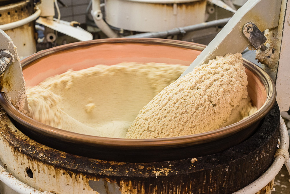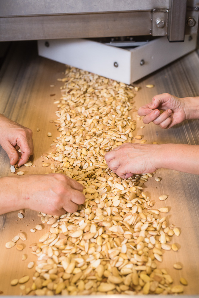 Die Röstung der Mandelmasse in 20 Röstkesseln über offener Flamme ist hingegen seit über 200 Jahren unverändert geblieben. Ein erfahrenes Team, darunter Konditoren und Süßwarentechnologen, überwacht den Prozess, bei dem das Mandel-Zucker-Gemisch langsam erhitzt wird. Auf diesem Weg entstehen die Röstaromen des Niederegger Marzipans. An der wichtigsten Zutat, den Mandeln, wird nicht gerüttelt. „Wir verarbeiten am liebsten Mandeln aus der Mittelmeerregion. Sie sind aromatischer als die kalifornischen, außerdem sind die Transportwege kürzer“, erläutert Nadine Petersen. Noch immer werden die Mandeln vor der Verarbeitung gründlich gesichtet und sortiert. „Eine Besonderheit unseres Marzipans ist, dass es zu zwei Dritteln aus Mandeln besteht. Damit enthält das Niederegger-Marzipan den geringstmöglichen Zuckergehalt aller Marzipane.“