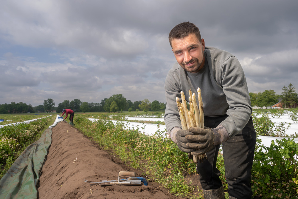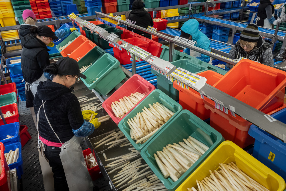 Stolz ist Friedrich Winkelmann auch, dass der gesamte Produktionsprozess auf dem Hof liegt. „Wir vermehren unsere Pflanzen auf speziell vorbereiteten Flächen, suchen die besten Sorten für unseren Standort, beraten über Anbauarten, Düngung und Bewässerung.“ Zeitig im Frühjahr werden die Dämme mit Folien belegt; so lässt sich die Temperatur für das Wachstum steuern. In der Hochsaison beschäftigt der Spargelhof bis zu 650 Mitarbeiter, vor allem aus Polen und Rumänien. „Spargelstechen ist Knochenarbeit“, weiß der Landwirt. „Aber auch ein geübtes Auge und Geschick im Umgang mit Spargelmesser und Kelle gehören dazu.“ Die frisch gestochenen Stangen werden auf dem Hof gewaschen und sortiert. Bei täglich 40 bis 50 Tonnen Ernte muss alles wie am Schnürchen laufen. Förderbänder, Waschanlagen, Schäl-, Sortier- und Verpackungsmaschinen sowie der Fuhrpark brauchen Wartung und Pflege. Der grüne Daumen der Winkelmanns zeigt sich auch im Obstanbau: Erdbeeren und Heidelbeeren werden auf 180 Hektar kultiviert.