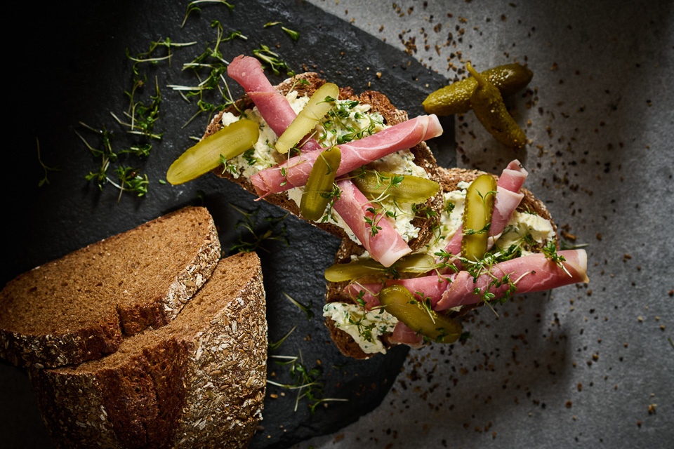 Brotscheiben mit der Frischkäsecreme bestreichen. Katenschinken zu Röllchen formen und auf die Brote legen. Cornichons längs in Scheiben schneiden und auf dem Schinken drapieren.