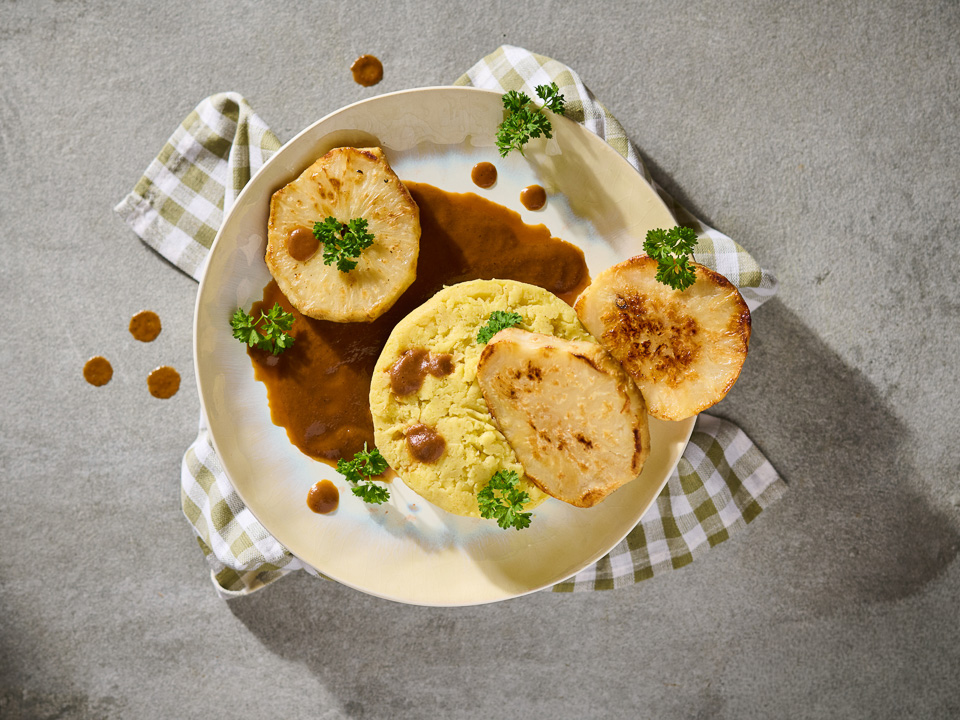 Gebratene Knollenselleriescheiben mit dunkler Soße