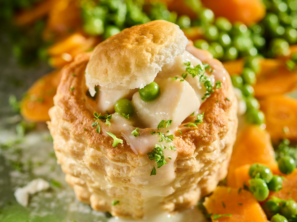 Hühnerfrikassee in einem Topf erwärmen. Backofen auf 175 Grad (Ober-/Unterhitze) vorheizen. Pasteten und Deckel 6 Minuten vor Ende der Garzeit des Gemüses in den Backofen geben.