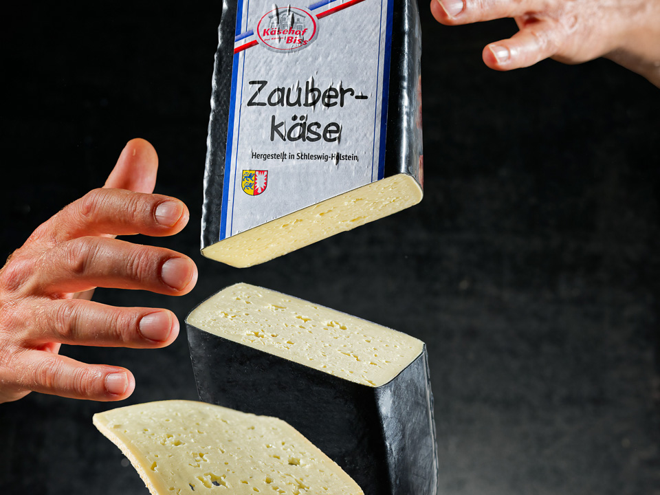Magie im Käse? Die allerletzten Geheimnisse wollen die Käsemacher nicht verraten, aber natürlich kommt es auf den Inhalt an! Der Zauberkäse ist ein norddeutscher Schnittkäse nach Tilsiter Art mit überraschenden Nuancen. Zunächst einmal ist er ein Käse aus pasteurisierter Kuhmilch, mindestens sechs Wochen naturgereift und mit 50 Prozent Fett in der Trockenmasse. Der Käseteig ist, wie in der Tilsiter-Familie üblich, schnittfest und cremig mit kleinen schlitzförmigen Löchern. Er wird von einer Naturrinde im auffälligen Wachsmantel umhüllt: Sie ist schwarz – wie der Umhang eines Magiers. Das Besondere: Der Zauberkäse enthält Zwiebeln und einen Hauch Knoblauch in Pulverform, außerdem eine Reihe von Kräutern. Im Teig ist diese feine Gewürzmischung jedoch unsichtbar, sie ist sozusagen wie von Zauberhand verschwunden. Dieser interessanten Rezeptur verdankt der Käse seinen würzig-aromatischen Geschmack und Geruch sowie den prägnanten Namen.