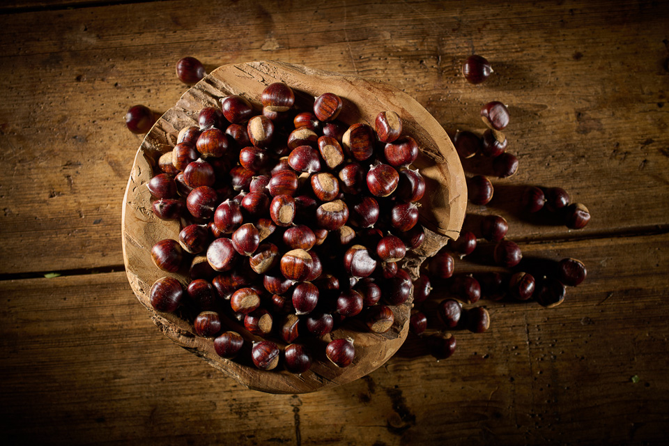 Maronen gehören wie Esskastanien zu den Edelkastaniensorten. Die glänzenden Rosskastanien hingegen, die wir im Herbst aufsammeln, sind nicht mit ihnen verwandt. Maronen sind im Vergleich zu Esskastanien größer und runder. Sie schmecken außerdem etwas intensiver und süßer. Im Mittelalter gehörten Esskastanien in Teilen Europas zu den Grundnahrungsmitteln. Da man schon lange wusste, dass die Früchte zu Mehl (übrigens glutenfrei) verarbeitet werden können, wird der bis zu 25 Meter hohe Maronenbaum auch Brotbaum genannt.